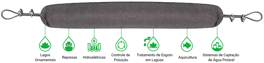 - Aplicação: Contenção de sólidos, plantas aquáticas e óleo superficial