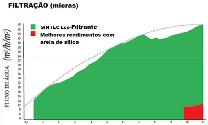 - Sintec Eco-Filtrante é projetado para alcançar a qualidade de agua equivalente a uma agua recém floculada. É neste caso em que este elemento filtrante demonstra qualidades excepcionais de verdade; não precisa de lavagem do filtro, nem a intervenção de floculantes químicos. Embora a taxa de filtração não seja suficiente para alcançar o maximo de desempenho, é necessario apenas fazer o funcionamento por mais tempo para melhorar os valores em circuitos de agua fechados como aquario, piscinas ou reservatórios.