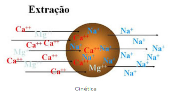 • Regeneração: é a rejeição dos íons de calcio e magnésio (Ca2+ e Mg2+) captados da agua, por meio da passagem de uma salmoura a 10% substituídos por íons de sódio que voltam a se prender ao grupamento do acido sulfônico;